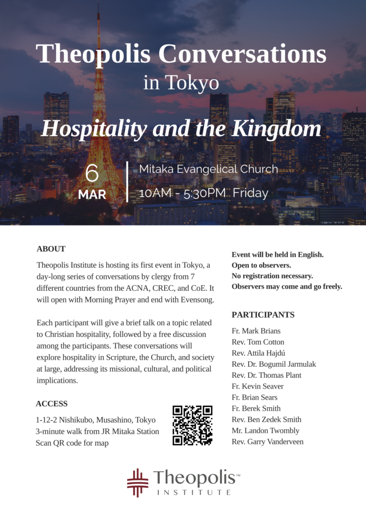 Theopolis Institute is hosting its first event in Tokyo, a day-long series of conversations by clergy from 7 different countries from the ACNA, CREC, and CoE. It will open with Morning Prayer and end with Evensong.